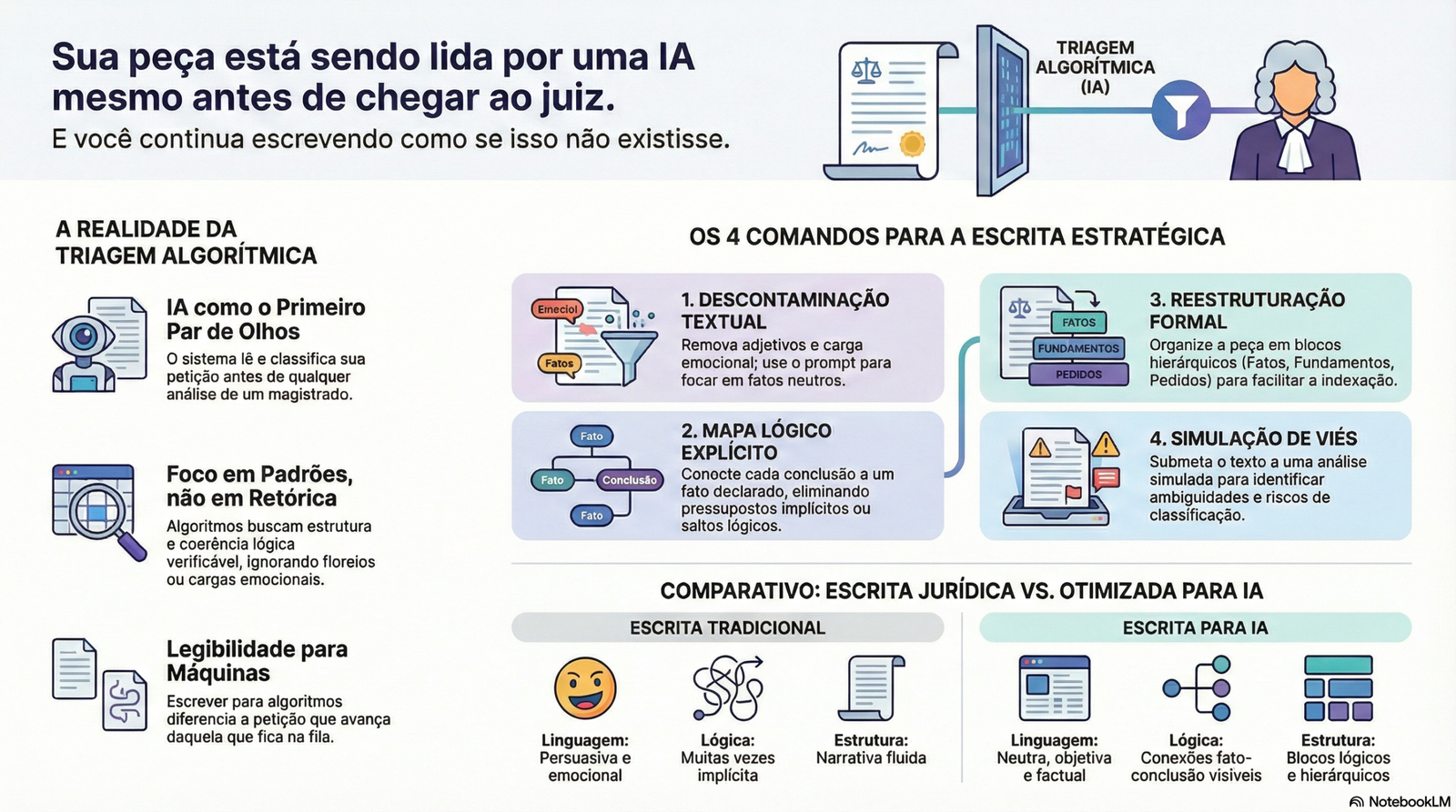 A transição é brutal: saímos do "convencimento humano" para a "identificação de padrões algorítmicos". Se a sua petição não for processável, ela será invisível. Adaptar sua escrita não é uma escolha estética; é uma manobra de engenharia para garantir que seu processo não apodreça em filas de baixa prioridade.