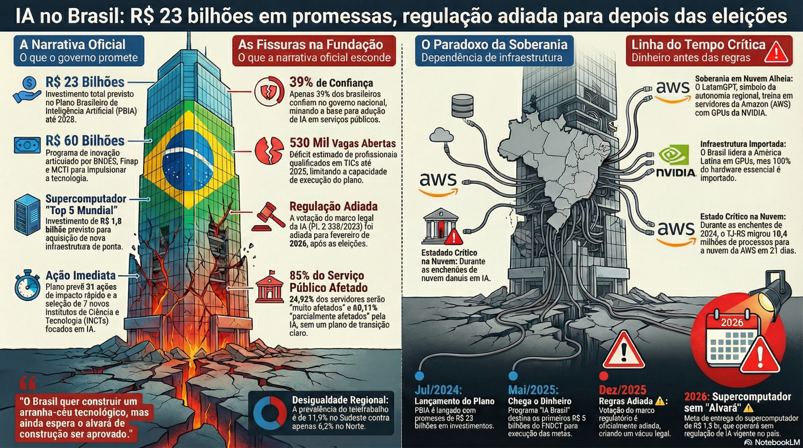 O Brasil está agindo como um construtor que finalmente comprou os materiais e contratou os engenheiros (PBIA e orçamento) para erguer um arranha-céu tecnológico, mas ainda espera que o alvará de construção (marco regulatório) seja aprovado para poder levantar os andares com segurança jurídica.