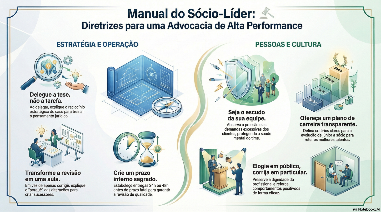 Não estamos falando de "chefe e empregado", mas de Sócio Sênior e Sócio em Potencial. A liderança em escritórios de advocacia eficaz é uma relação de espelhamento e interesse mútuo. Esta cartilha está estruturada em 25 diretrizes táticas, focadas no como, quem, quando e porquê.