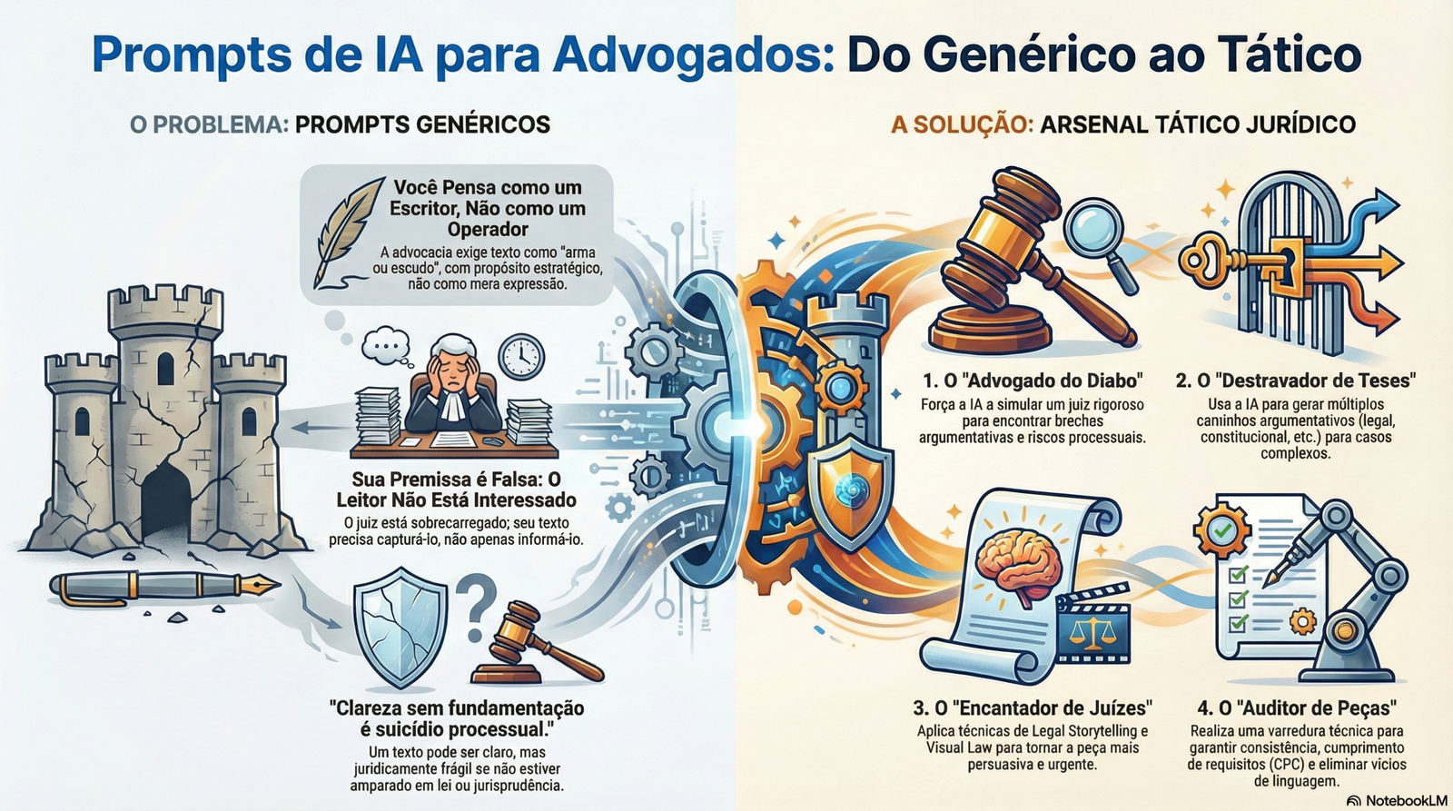 "No Direito, seu texto é uma arma ou um escudo. Prompts genéricos te deixam desarmado."