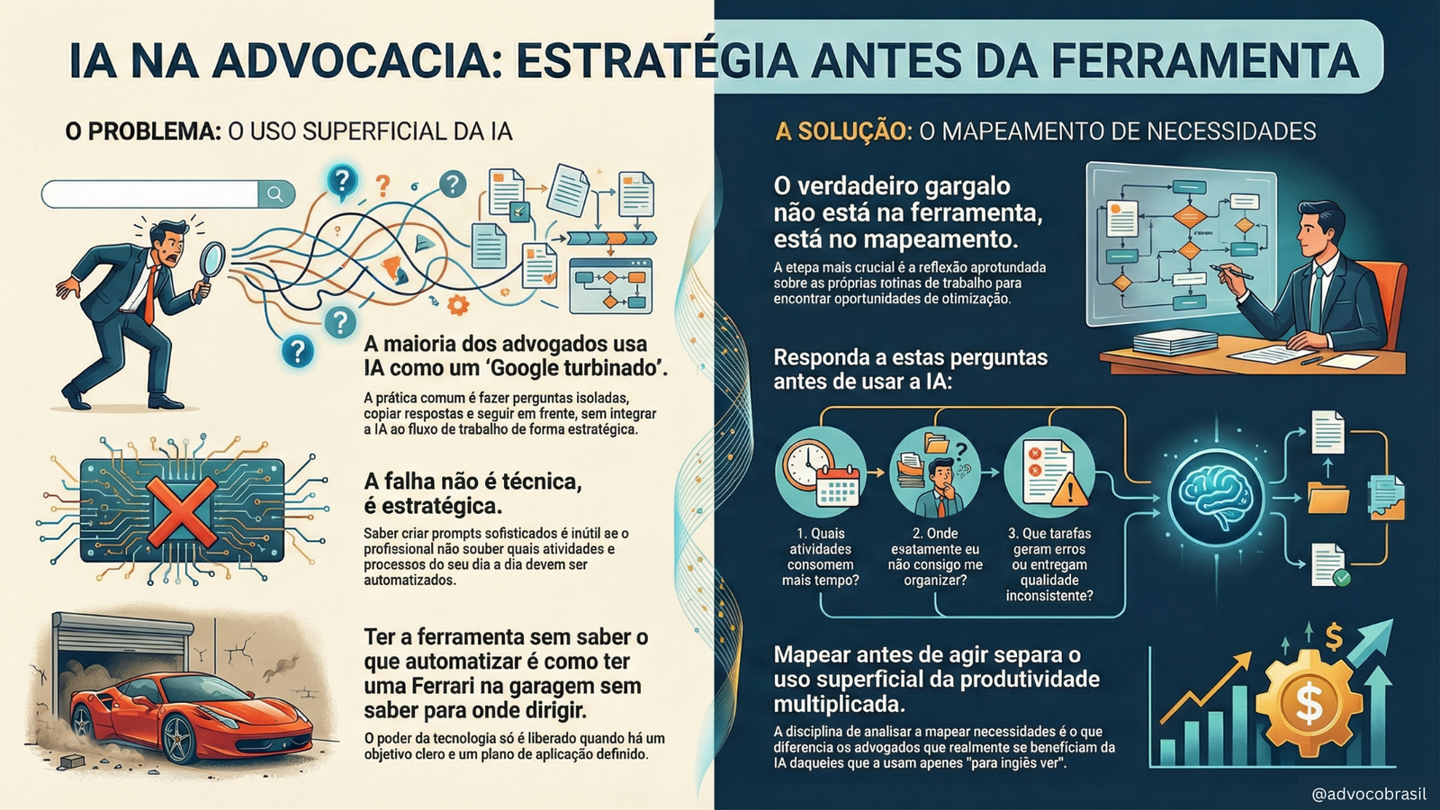 Por que isso importa? Porque a diferença entre advogados que usam IA "para inglês ver" e aqueles que multiplicam produtividade está aqui: na disciplina de mapear necessidades antes de apertar "Enter".